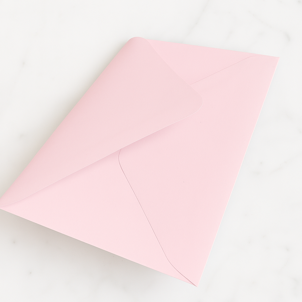 Envelope: A7.5 Euroflap envelopes in Colors Matt Powder Pink (71) measure 5.5 x 7.5 & have a deep flap. Paper is rich to the feel and made using thick 81lb text (120GSM) paper stock.